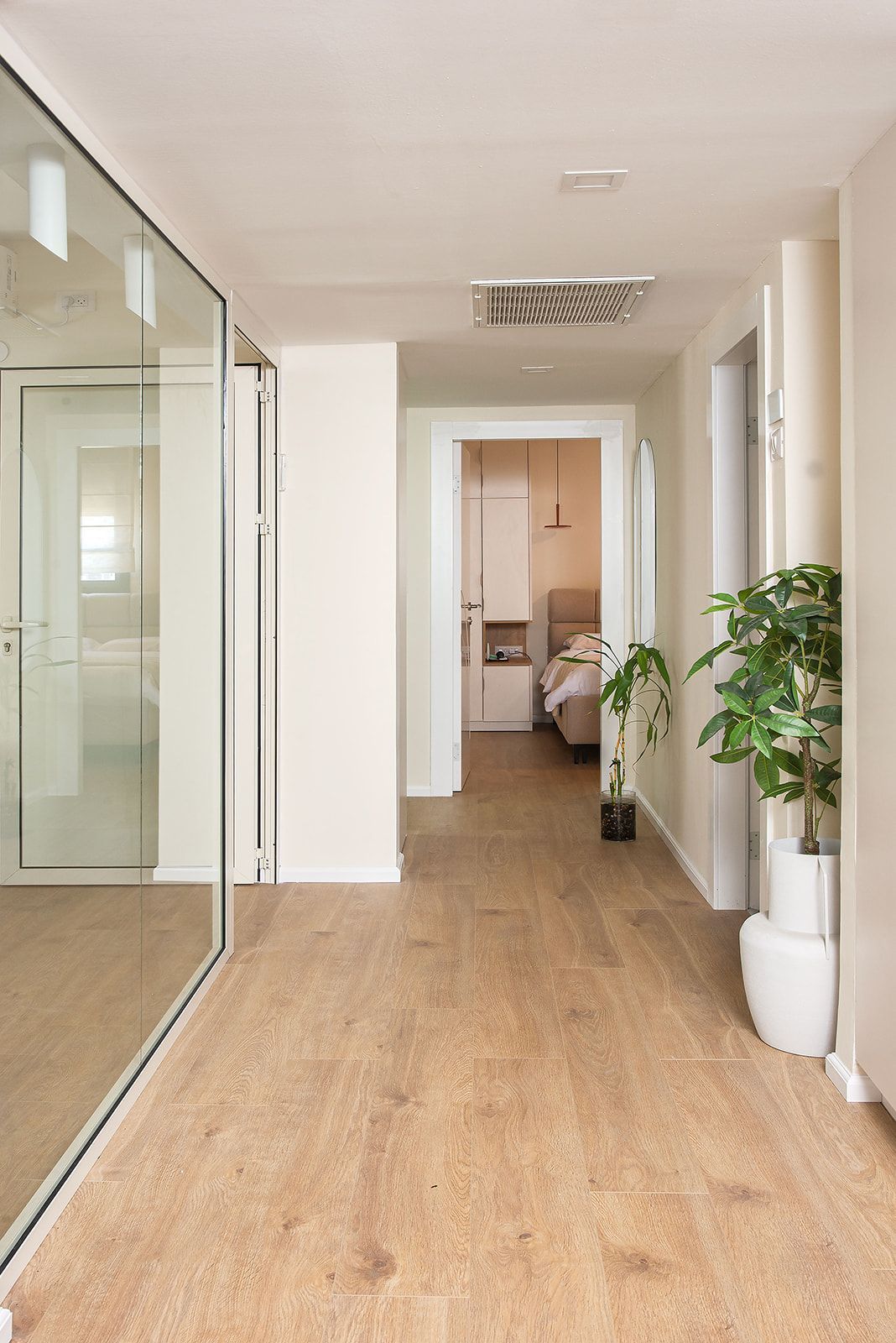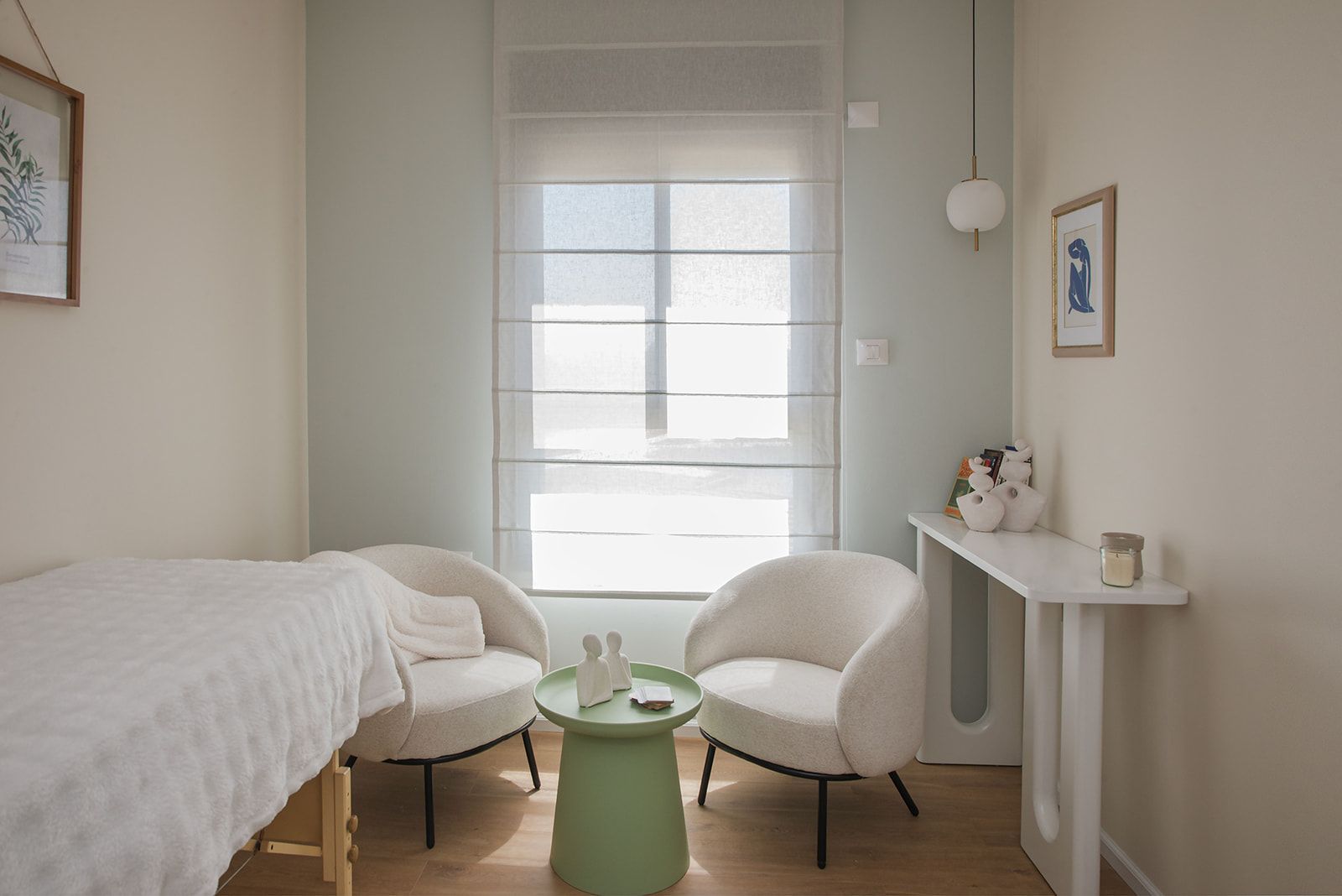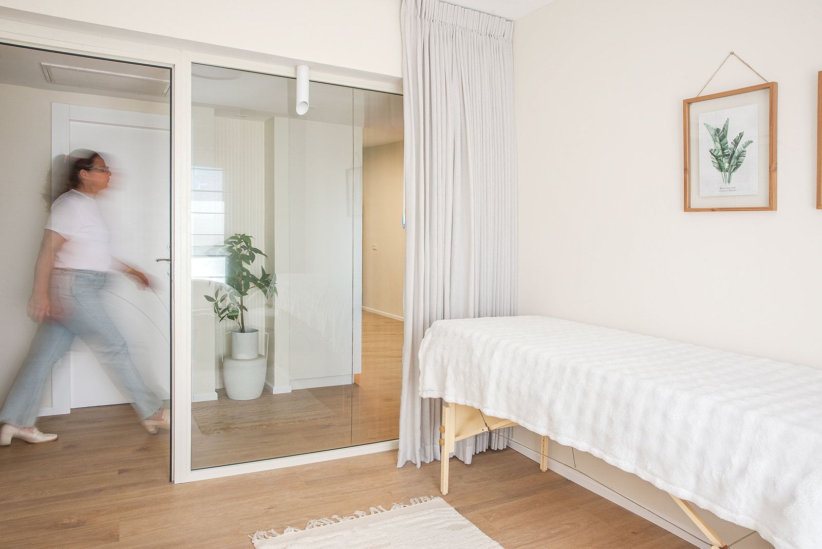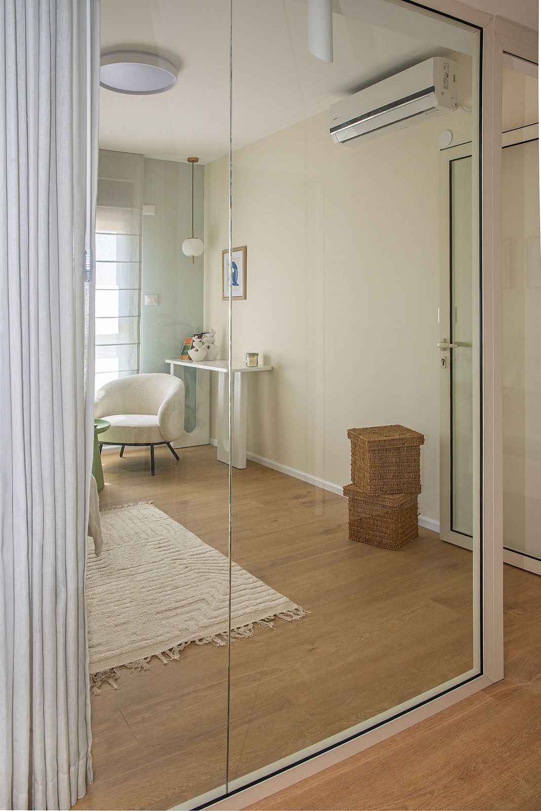 את החדר הראשון בכניסה הסבנו לקליניקה מזמינה עבורם. קיר זכוכית עם וילון מאפשר גמישות