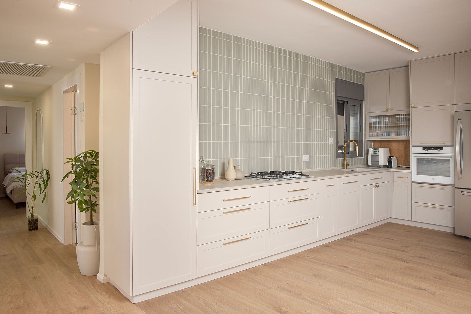 המטבח תוכנן במיוחד עבור אהבת הבישול של בעלת הבית, עם אינטגרציה הרמונית לפינת האוכל והסלון, המתאימה לאופיים החם והמארח.