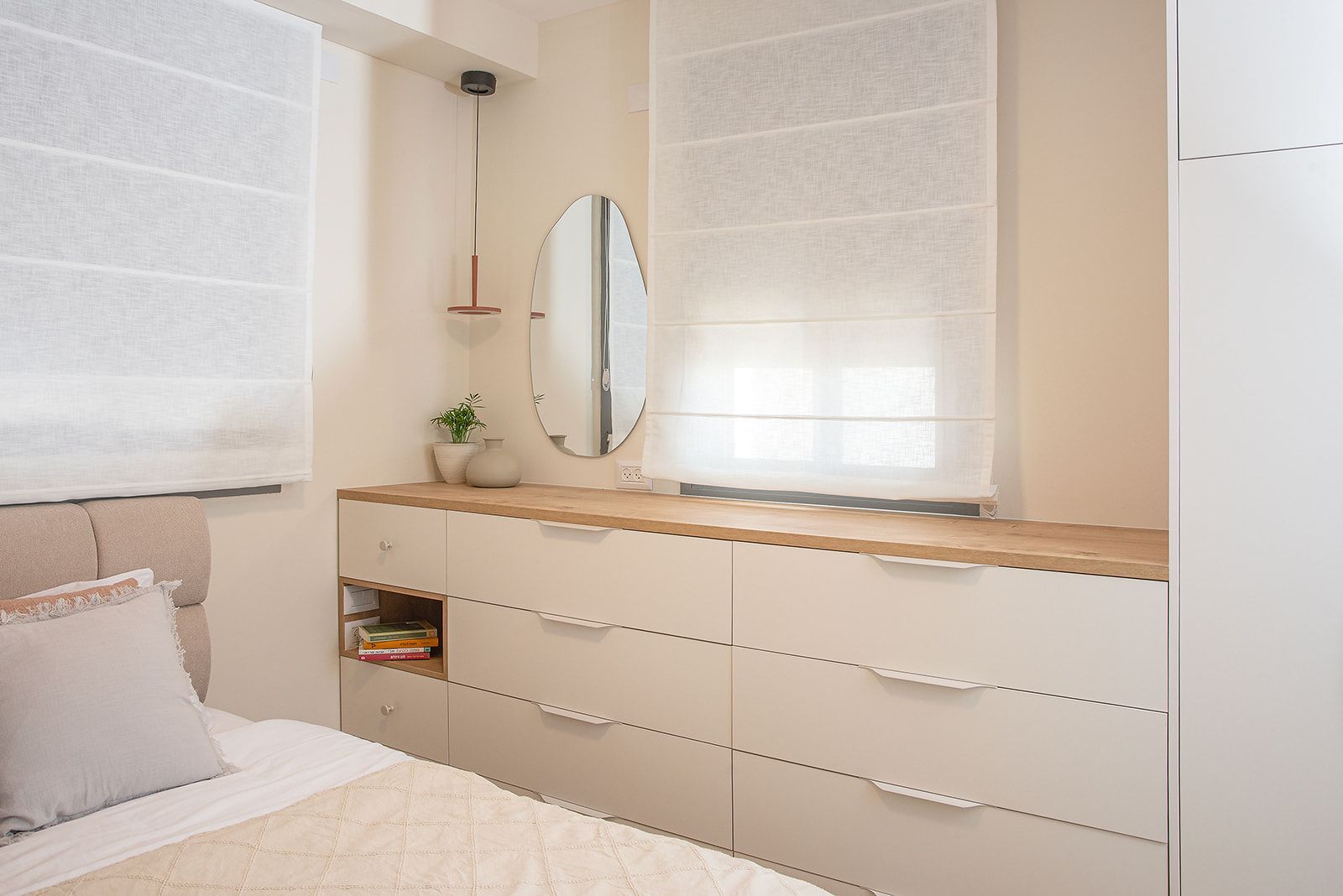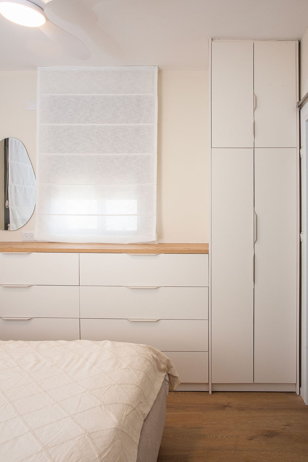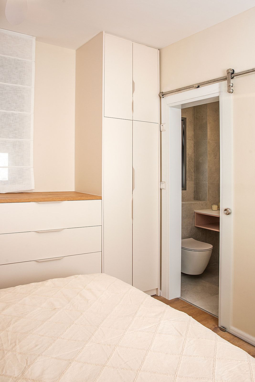 בחדר השינה המרווח תכננתי פתרונות אחסון חכמים, וחיברתי את חדר הרחצה הצמוד באמצעות דלת זכוכית גלית עדינה.